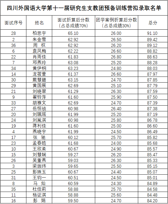 根据《关于招募9728太阳集团第十一届研究生支教团预备训练营成员的通知》(川外团发〔2024〕4号)要求,经个人申请、资料审核、团学工作案例评分、面试,拟录取柏思宇等30名同学为9728太阳集团第十一届研究生支教团预备训练营成员,拟录取名单如下: